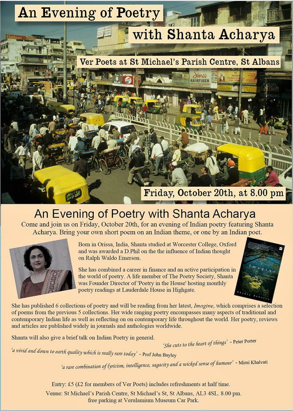 - Poetry Reading by Shanta Acharya, supported by contributions from Martyn Crucefix and Sue Hubbard. With an introduction by Janet Wilson, Professor of English and Postcolonial Studies at the University of Northampton.