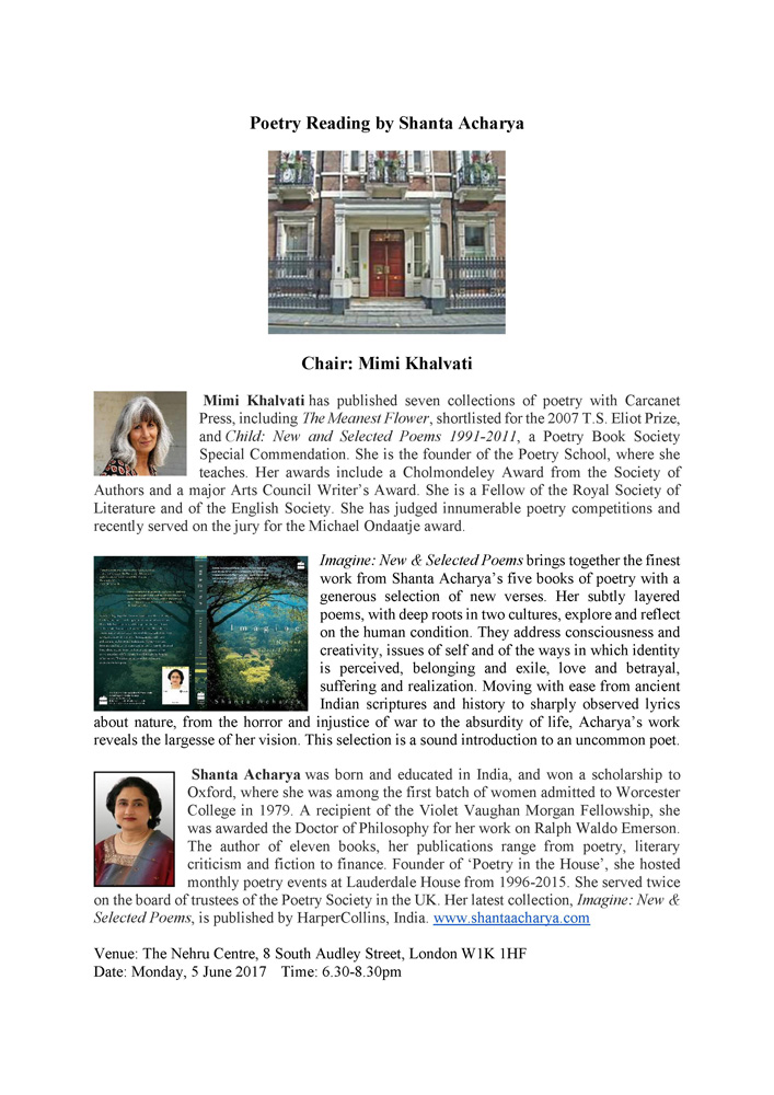 - Poetry Reading by Shanta Acharya. Event chaired by Mimi Khalvati.